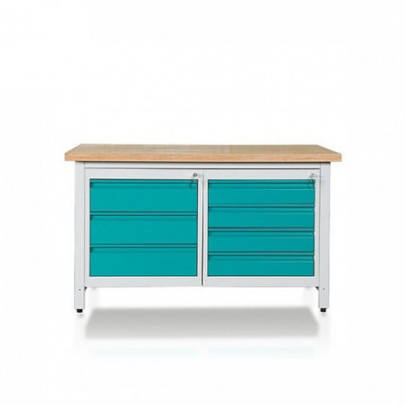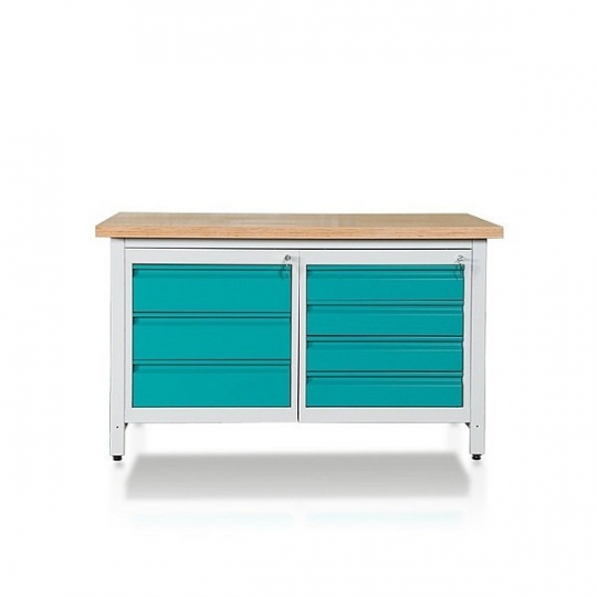 STÓŁ WARSZTATOWY Z SZAFKĄ WSZ-C I WSZ-D \nStół wykonany jest z profili metalowych z blachy o grubości 2 mm, wyposażony w blat ze sklejki o grubości 40 mm. Możliwość wyposażenia w regulowane stopki. Malowany jest farbami proszkowymi (epoksydowo-poliestrowymi) w kolorze RAL7035, szuflady w kolorze RAL6033.