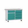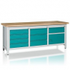 Meble warsztatowe to także stoły. Metalową konstrukcję wyposażono w szafki oraz praktyczne półki. Do stołów dołączono regulowane stopki. Ich wykorzystywanie umożliwiło płynną stabilizację stołu na każdej nawierzchni. Różne warianty stołu to gwarancja dużej możliwości wyboru. Do stołu dołączono następujące dodatki: metalowe półki, nakładki z gumy oraz blachy, a także stopki poziomujące.