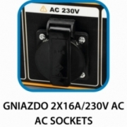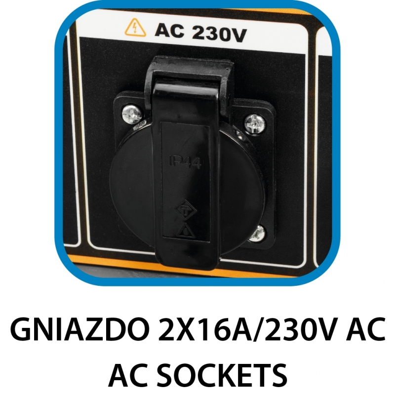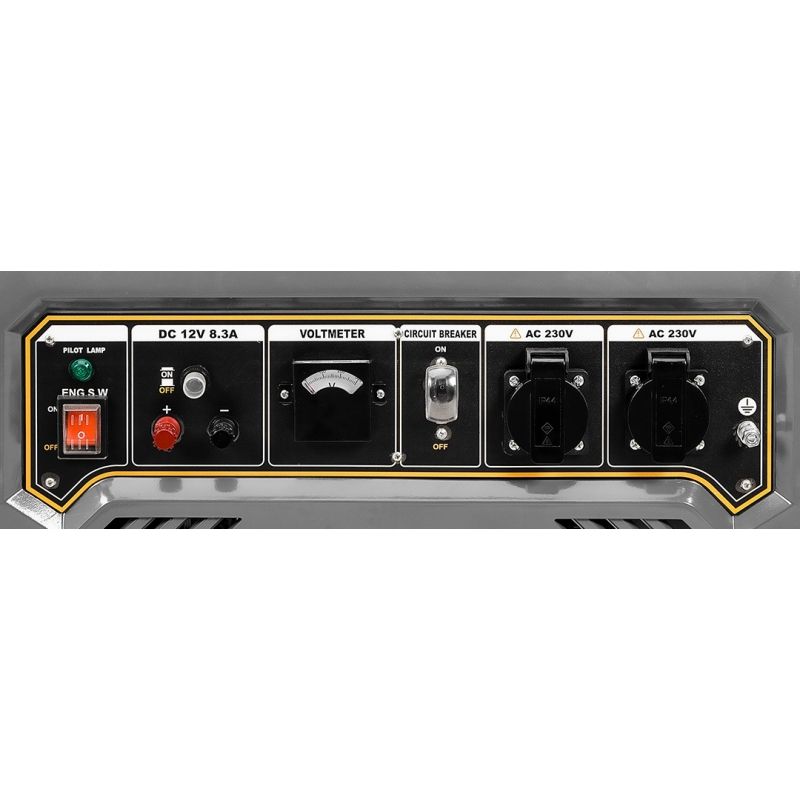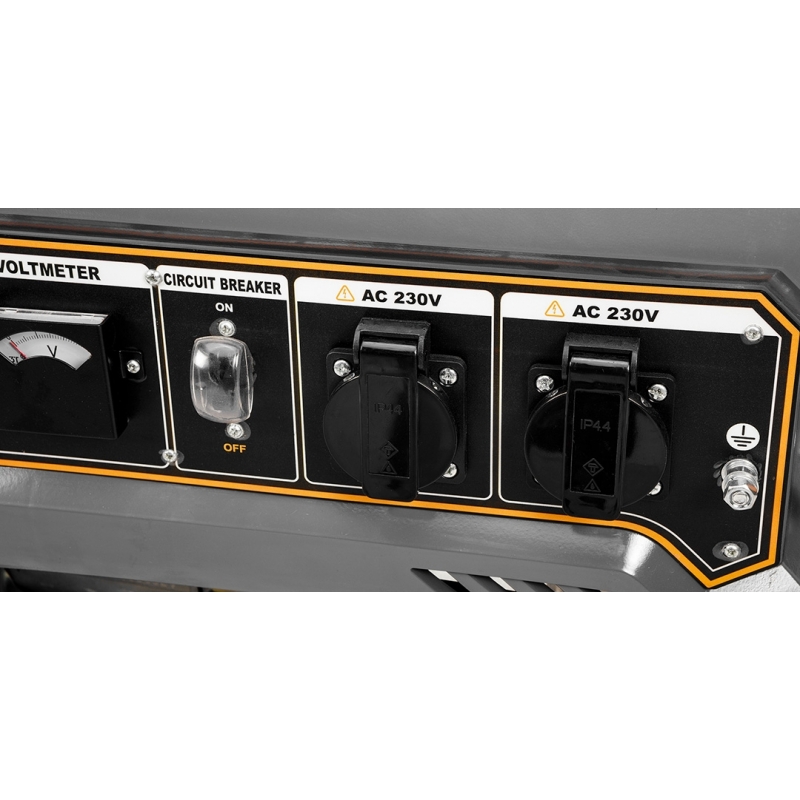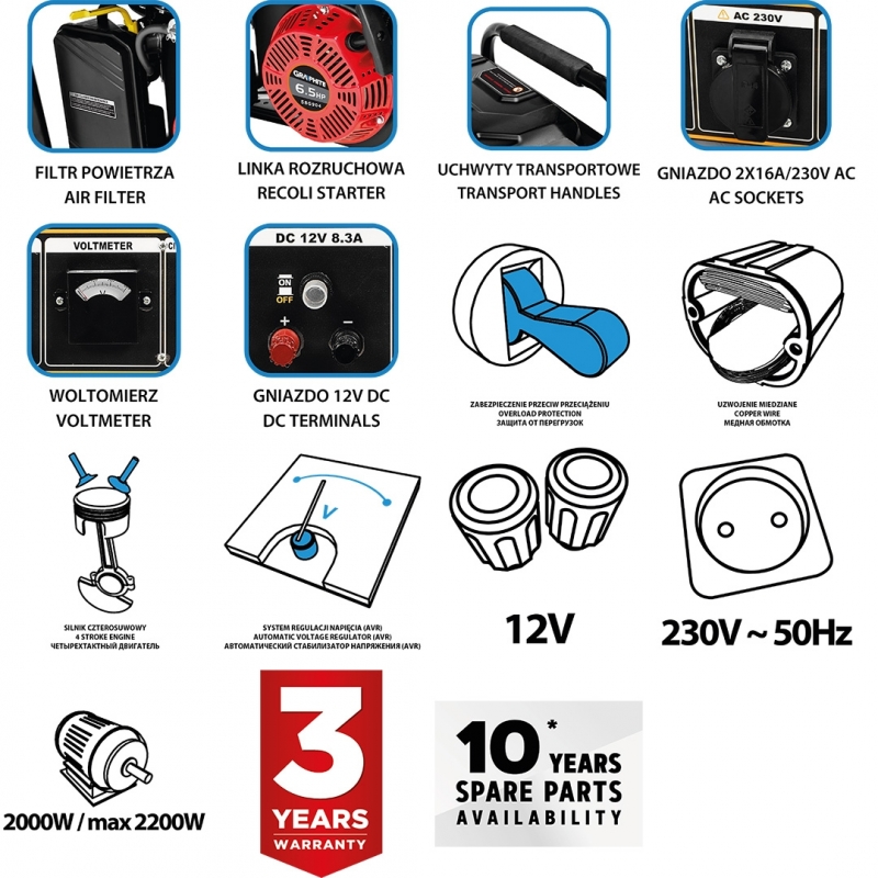 Wysokiej klasy generator prądotwórczy przeznaczone do zasilania różnego typu urządzeń elektrycznych w miejscach bez dostępu do sieci. Moc: 2000/2200W, silnik benzynowy 4.8kW/6.5kM, zbiornik 15 l, średnie zużycie paliwa 2.44 l/h, min spalanie 360g/kW.h , wymiary (LxWxH) 605x445x455 mm, olej SAE15W-30, ilość oleju do silnika 0,6l, paliwo 92,95,98, gniazdo 1 x 12V + 2 x 230V(16A), waga 41 kg, 6,5HP, EURO V, AVR, IP 23M, typ świecy zapłonowej F6RTC , obroty 3000 min⁻¹, pojemność skokowa 196 CC, LwA= 95 db