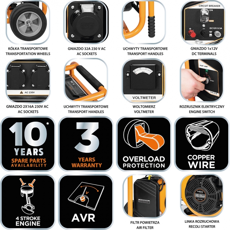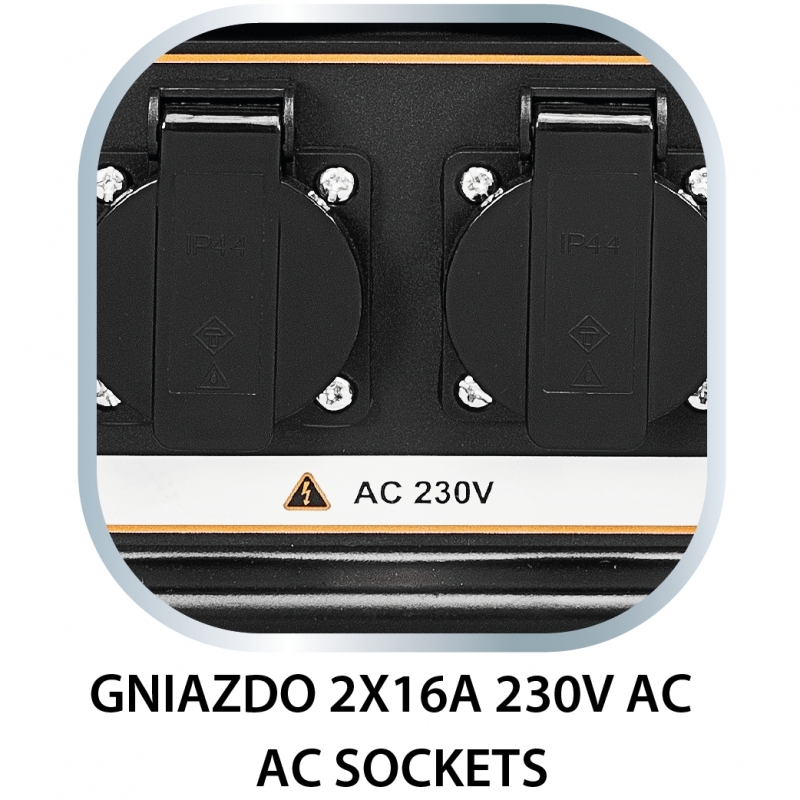 Wysokiej klasy generator prądotwórczy przeznaczone do zasilania różnego typu urządzeń elektrycznych w miejscach bez dostępu do sieci. Moc: 6000W/6500W, gniazdo 1x12V + 2x230V(16A) + 1x230V(32A), silnik benzynowy 11 kW/15 kM, zbiornik 25 l, min zużycie paliwa 0,313 g/kW.h średnie zużycie paliwa 4,89 l/h, wymiary (LxWxH) 815x530x 560, olej SAE15W-30, ilość oleju1,1l, paliwo 92,95,98, LwA = 97dB, waga 87 kg, 15HP, EURO V, AVR, IP 23M, 25A, typ świecy zapłonowej F6RTC, obroty 3000 min⁻¹, pojemność skokowa 420 CC