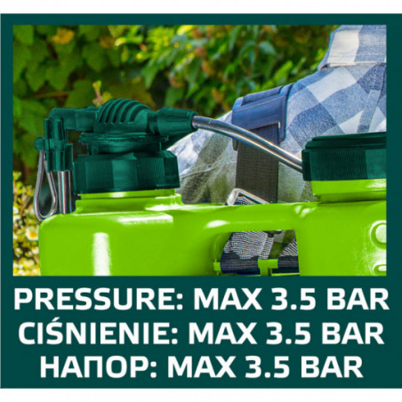 Opryskiwacz ciśnieniowy 15 L, ciśnienie robocze 2.5 - 3.5 bary, możliwość użytkowania w temperaturze 0°- 45°C