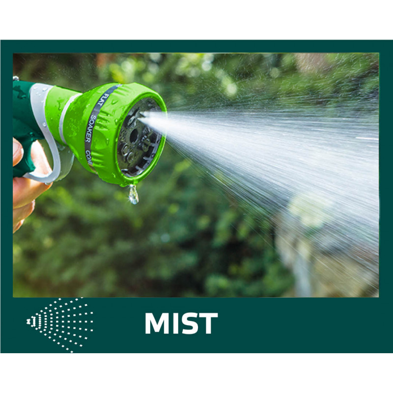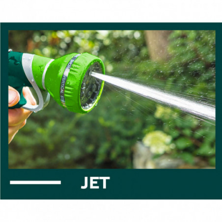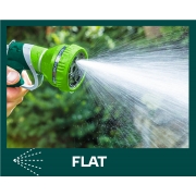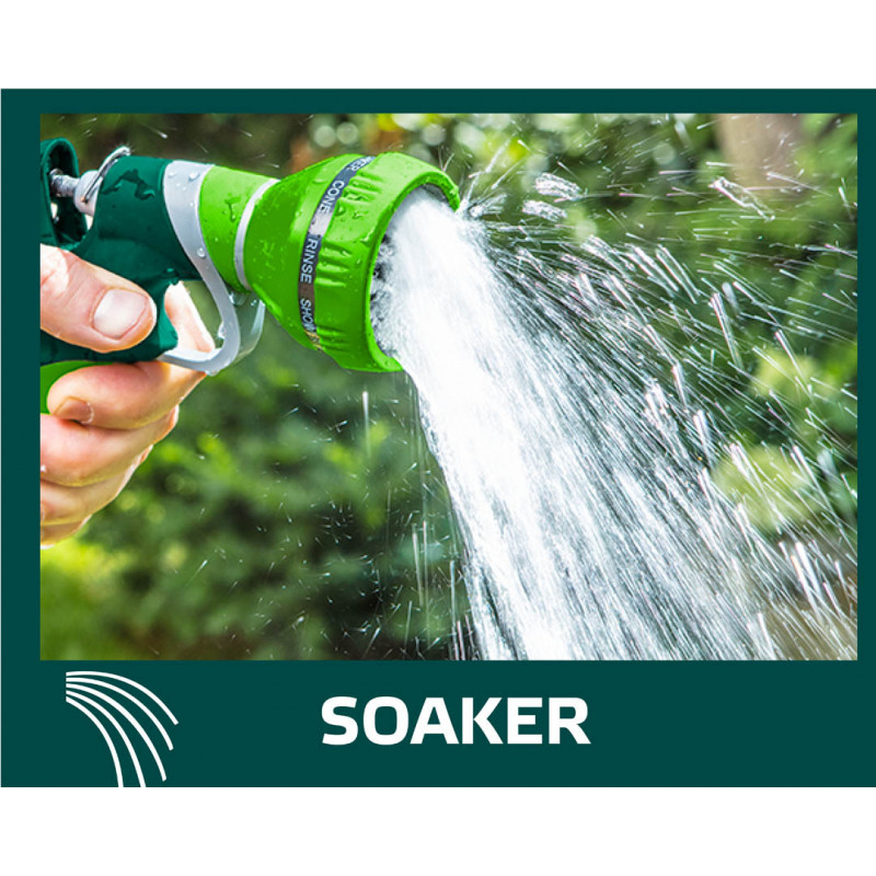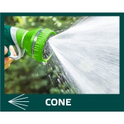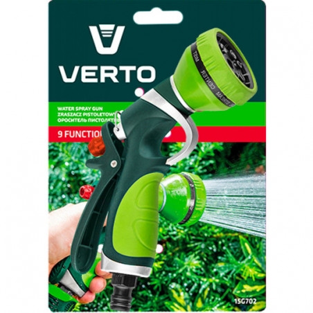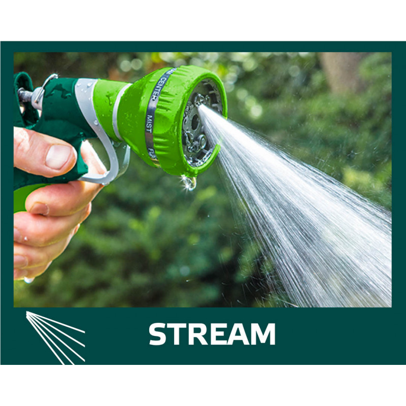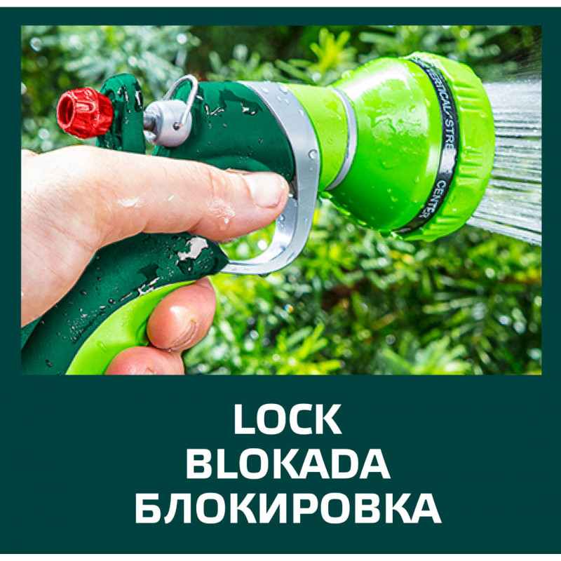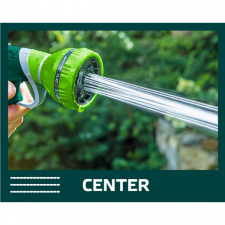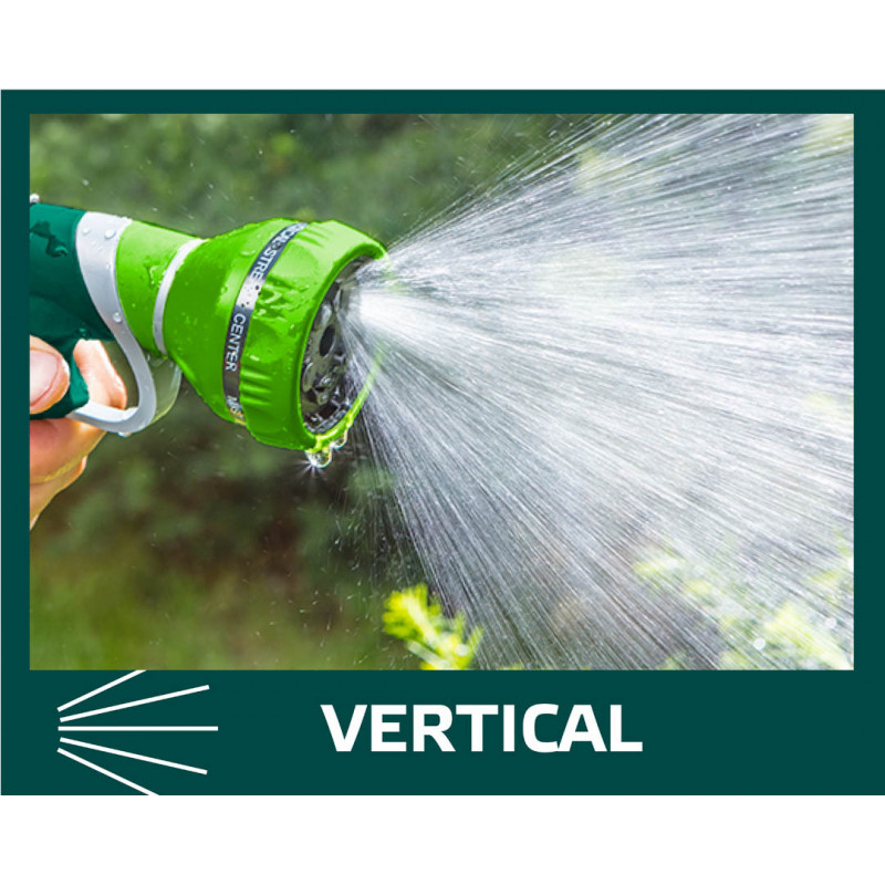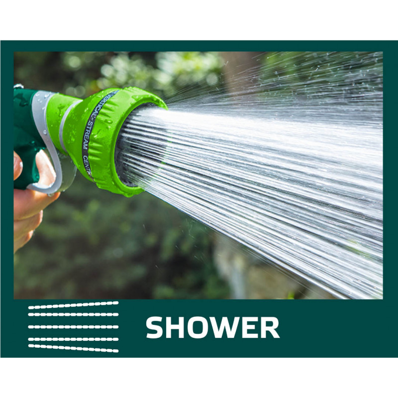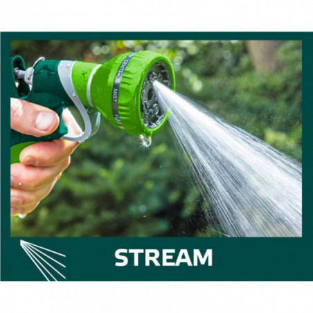 Zraszacz pistoletowy 9-funkcyjny, możliwość wyboru strumienia o różnej sile i funkcji, czytelne oznakowanie rodzaju strumienia, tylna dźwignia z blokadą, dwumateriałowy uchwyt