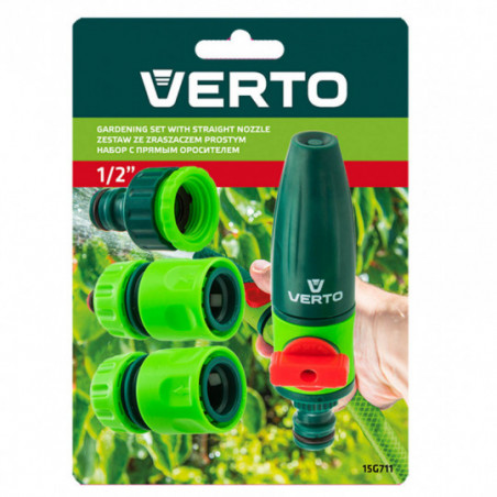 Zestaw ze zraszaczem prostym, złączkami jednomateriałowymi, przyłączem do kranu, 4 elementy: zraszacz prosty z blokadą wypływu wody, złączka przelotowa 1/2", złączka stop 1/2", przyłącze do kranu 1/2"