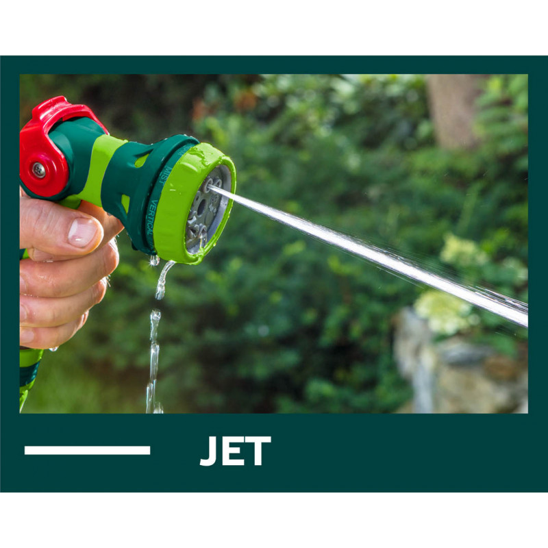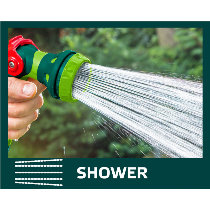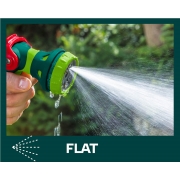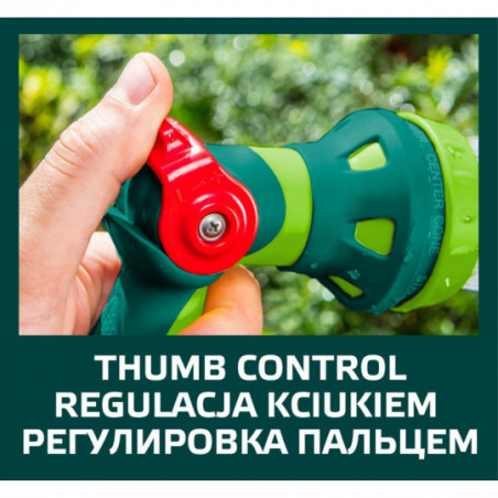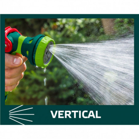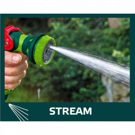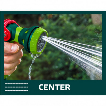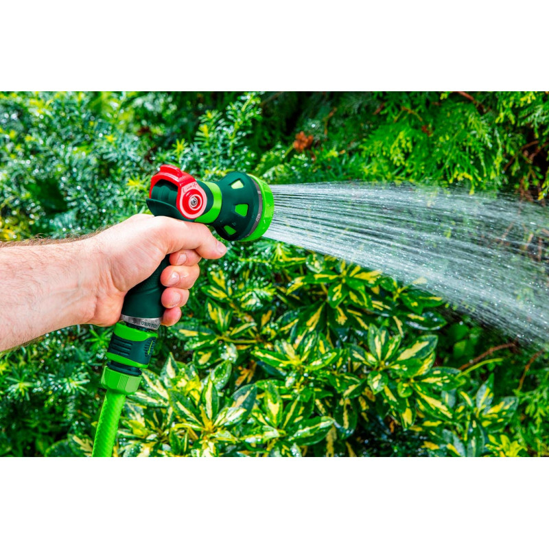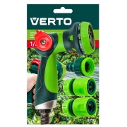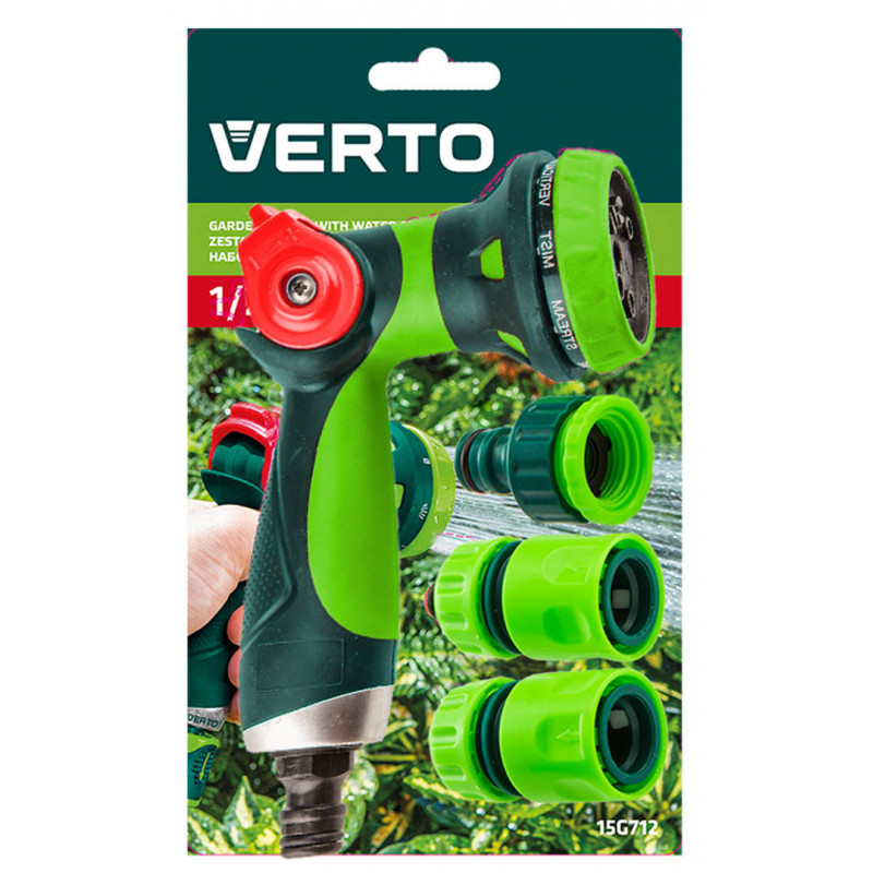 Zestaw z pistoletem zraszającym, złączkami jednomateriałowymi, przyłączem do kranu, 4 elementy: zraszacz z płynną regulacją strumienia 8-funkcyjny, złączka przelotowa 1/2", złączka stop 1/2", przyłącze do kranu 1/2"