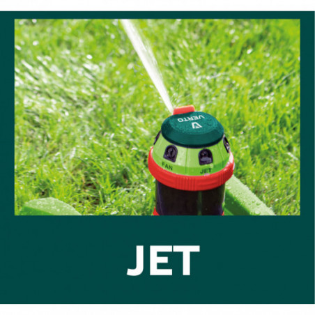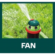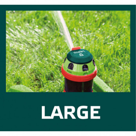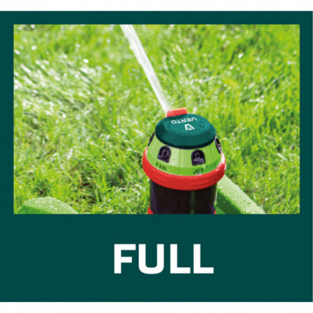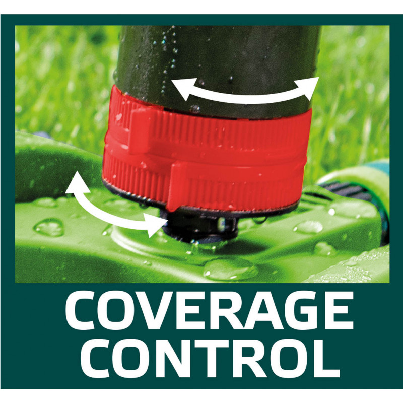Zraszacz ogrodowy, 6- funcyjny z napędem, regulowany zasięg, stabilna podstawa z tworzywa, regulacja zakresu podlewania i kąta strumienia, maksymalna powierzchnia podlewania 350 m2