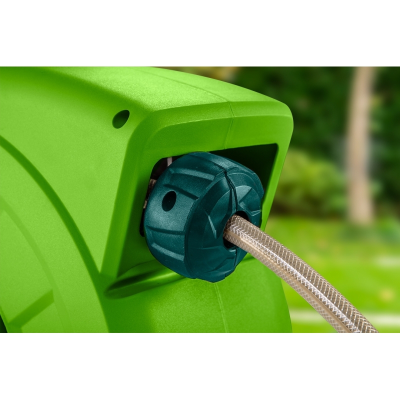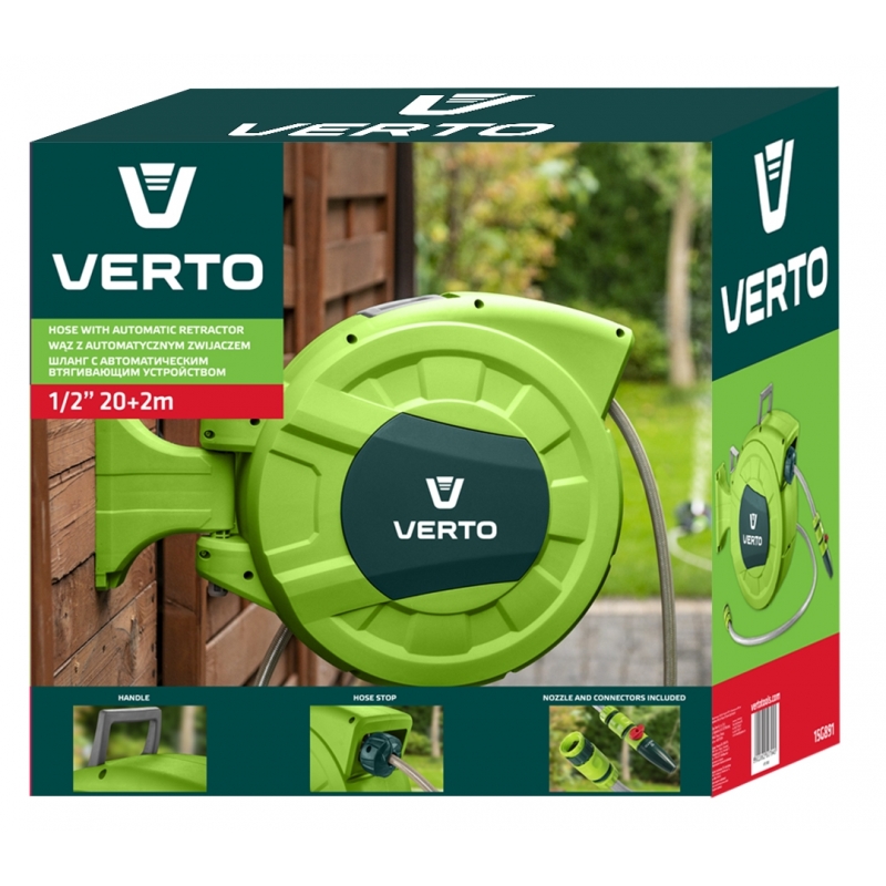 Wąz z automatycznym zwijaczem 1/2", 20 m +2m, ciśnienie robocze 10 bar, obudowa PP, wąż PVC, zakres temperatur pracy: -5 do +55°C, waga 7 kg, zestaw zawierający automatyczny zwijacz wraz ze zraszaczem, przyłączem do kranu oraz złączkami, system automatycznego zwijania z mechanizmem hamującym, możliwość zablokowania węża na dowolnej długości, system prowadnic umożliwiający zwijanie bez zagięć, uchwyt montażowy z zakresem ruchu 180 st., jednomateriałowy uchwyt do przenoszenia z PP, nylonowy trzpień do mocowania na uchwycie