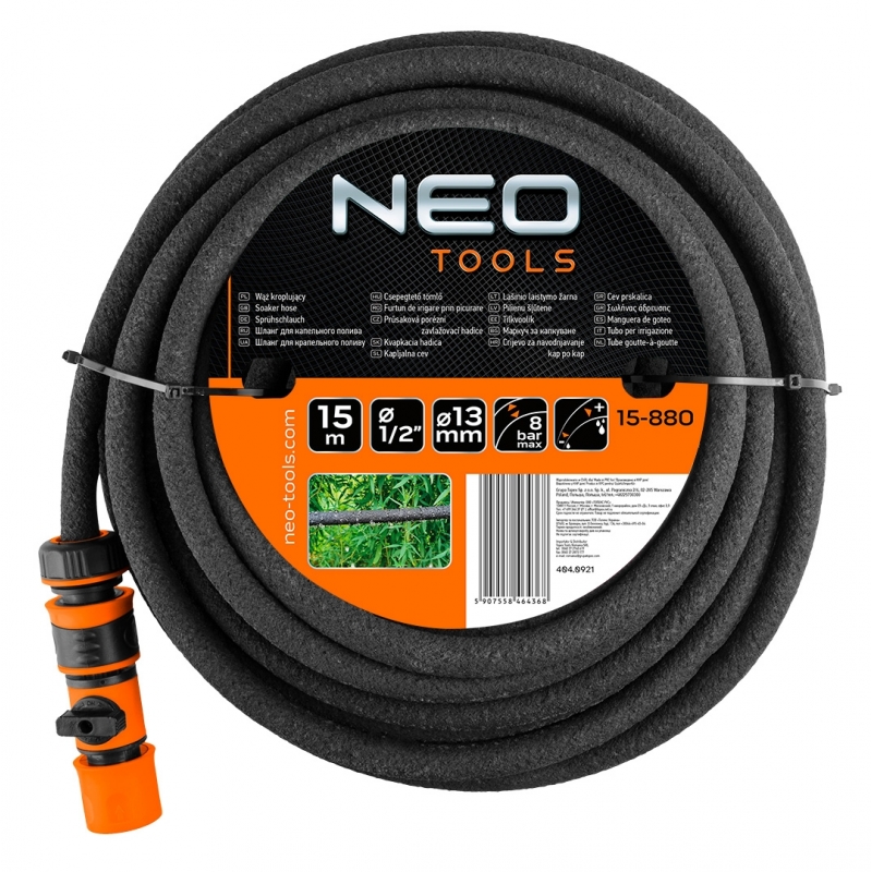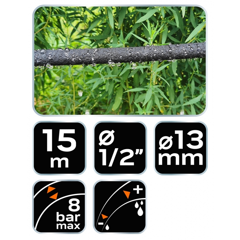 Wąż ogrodowy kroplujący 15 m, średnica 1/2”, idealny do układania precyzyjnych i niewidocznych systemów nawadniania, przyłącze do węża ogrodowego, wyposażony w zawór odcinający
