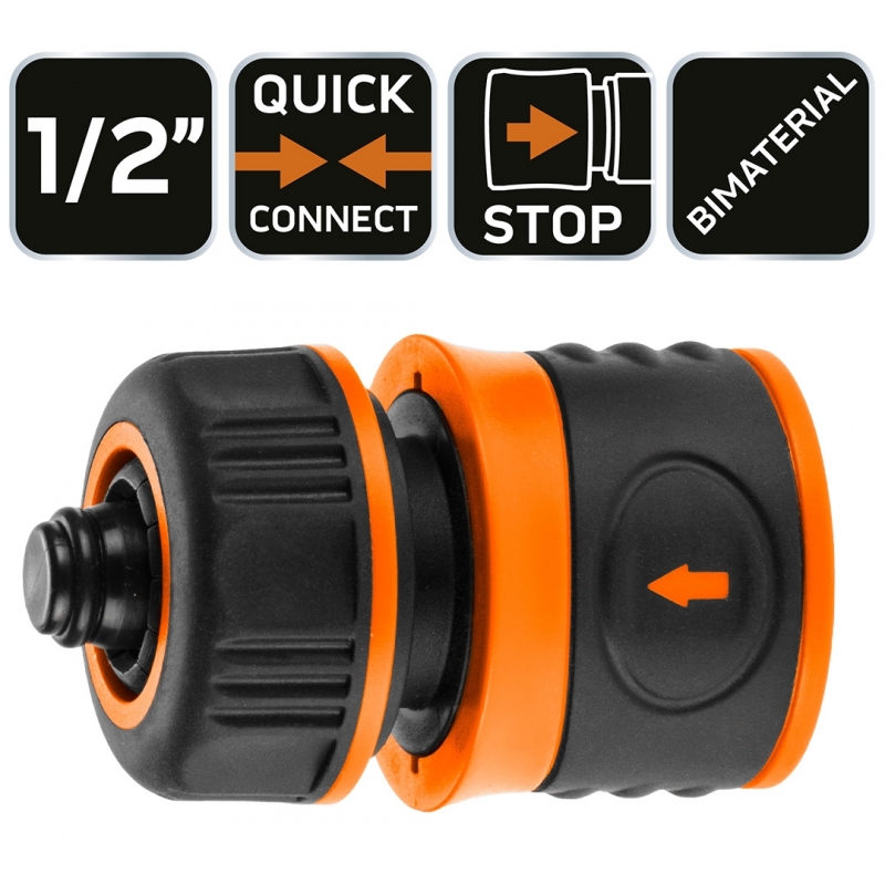 Złączka przelotowa STOP 1/2", dwumateriałowa, wykonane z wysokiej jakości tworzywa, pokrycie gumą pozwala na pewny chwyt i zapobiega wyślizgiwaniu się z ręki, funkcja stop odcinająca wypływ wody po rozłączeniu ze zraszaczem