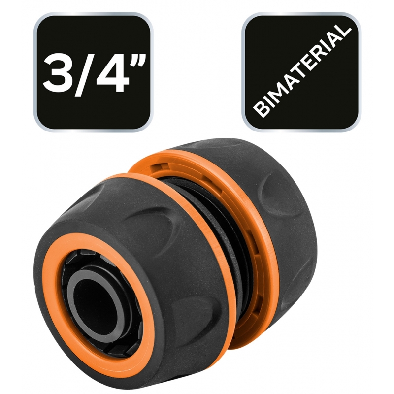 Reparator węża 3/4", dwumateriałowy, wykonane z wysokiej jakości tworzywa, pokrycie gumą pozwala na pewny chwyt i zapobiega wyślizgiwaniu się z ręki, pozwala na naprawę uszkodzonego węża lub połączenie węży w celu ich przedłużenia