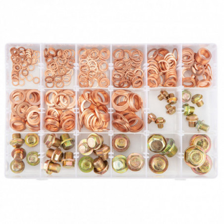 Podkładki miedziane:50 x (6x10x1 mm), 50 x (8x12x1 mm), 50 x (10x14x1 mm), 50 x (12x16x1 mm), 50 x (13x18x1 mm), 50 x (14x20x1 mm), 50 x (15x22x1 mm), 50 x (16x22x1 mm), 50 x (18x24x1 mm), 50 x (20x24.5x1 mm).Korki:5 x (M8x1), 5 x (M10x1), 5 x (M12x1.5), 5 x (G1/4), 5 x (M14x1.5), 3 x (M16x1.5), 3 x (M18x1.5), 3 x (M20x1.5)