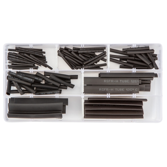 Koszulki termokurczliwe: 30 x (2.0 x 40 mm), 25 x (2.5 x 40 mm), 20 x (3.5 x 40 mm), 20 x (5.0 x 40 mm), 16 x (7.0 x 80 mm), 8 x (10.0 x 80 mm), 8 x (13.0 x 85 mm)