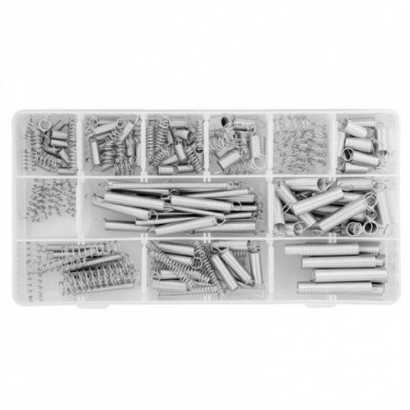 Sprężyny: 12 x (4x79.5 mm), 8 x (4.5x44.5 mm), 10 x (5x20.5 mm), 10 x (5.5x17.5 mm), 10 x (5.5x25.5 mm), 10 x (5.5x38 mm), 10x (6.5x10 mm), 10 x (6.5x22 mm), 10 x (7x12.5 mm), 10 x (7x19 mm), 10 x (7x38 mm), 10 x (7x51 mm), 8 x (8x28.5 mm), 10 x (8x31.5 mm), 12 x (8x44.5 mm), 10 x (8.5x36.5 mm), 12 x (8.5x47 mm), 8 x (9x35 mm), 6 x (9.5x16 mm), 12 x (9.5x19 mm)