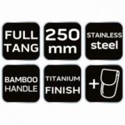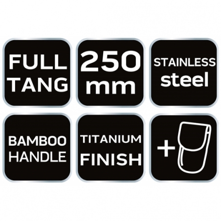 Nóż taktyczny długość 25 cm, konstrukcja full tang, ostrze 14.5cm, uchwyt z bambusa, stal nierdzewna 3Cr13, ostrze pokryte tytanem, pouch nylonowy
