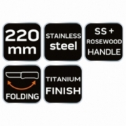 Nóż długość 22 cm, konstrukcja składana, ostrze 11 cm, uchwyt SS+drewno, stal nierdzewna 3Cr13, ostrze pokryte satyną, zaczep na pasek