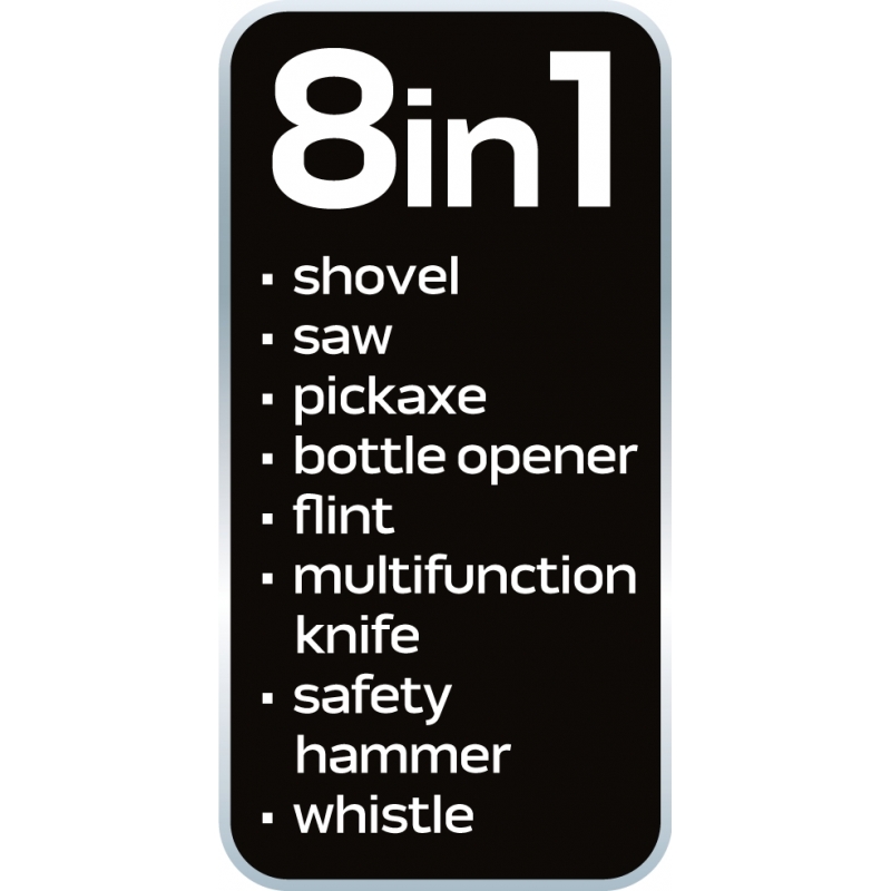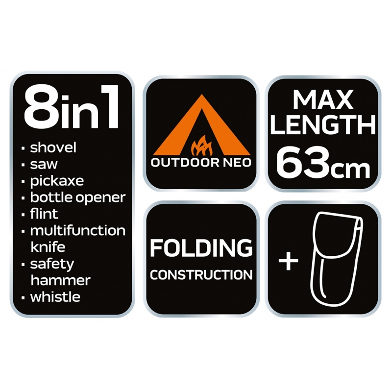 Wielofunkcyjna saperka survivalowa max długość 63 cm, składana konstrukcja, 8 w 1 szpadel, piła, kilof, otwieracz butelek, krzesiwo, nóż wielofunkcyjny, wybijak, gwizdek, pouch do przenoszenia i składowania