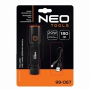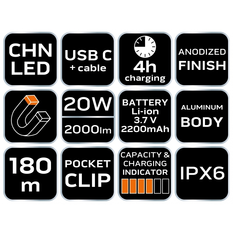 Latarka akumulatorowa USB C 2000 lm, 20W, CHN LED, zasięgu 180m, wskaźnik naładowania baterii, wskaźnik ładowania, akumulator li-ion 3.7V 2200mAh, magnes, aluminiowy korpus, przewód USB C, zaczep na kieszeń, anodyzowana powierzchnia korpusu, IPX6, czas ładowania 4h, czas pracy 4h, 5 funkcji działania 100% mocy czas pracy max 20 sec, 30%, 10%, 3%, strobe.