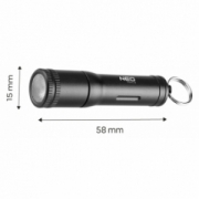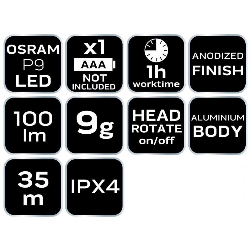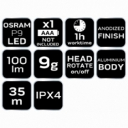 Latarka bateryjna mini 100 lm, waga 9g, Osram P9 LED, czas pracy 1h, zasięg 35m, aluminiowy korpus, anodyzowana powierzchnia korpusu, IPX4, włącznik/wyłącznik przekręcenie głowicy, zasilanie 1 bateria AAA (brak w zestawi)