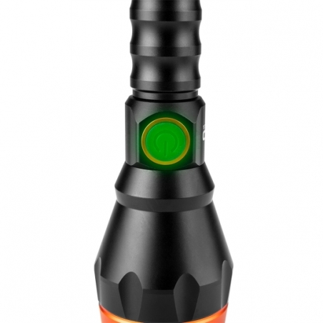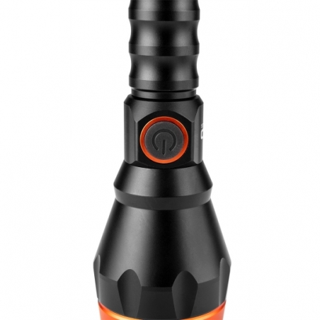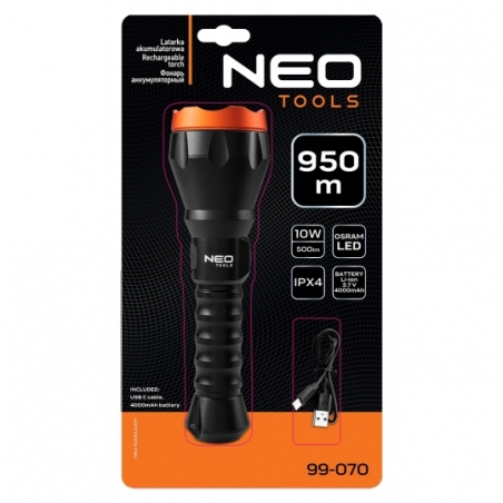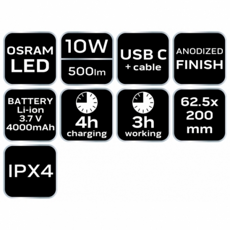 Latarka akumulatorowa USB C 500 lm, 10W, Osram LED, IPX4, akumulator li-ion 3.7V 4000mAh, zasięg 950m, przewód USB C, czas pracy 3h, czas ładowania 4h, IPX4, korpus aluminiowy, powierzchnia korpusu anodyzowana, 4 funkcje świecenia 100%, 50%, 10%, strobe
