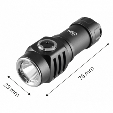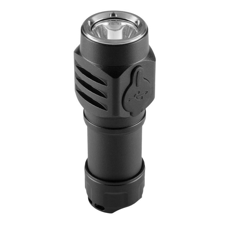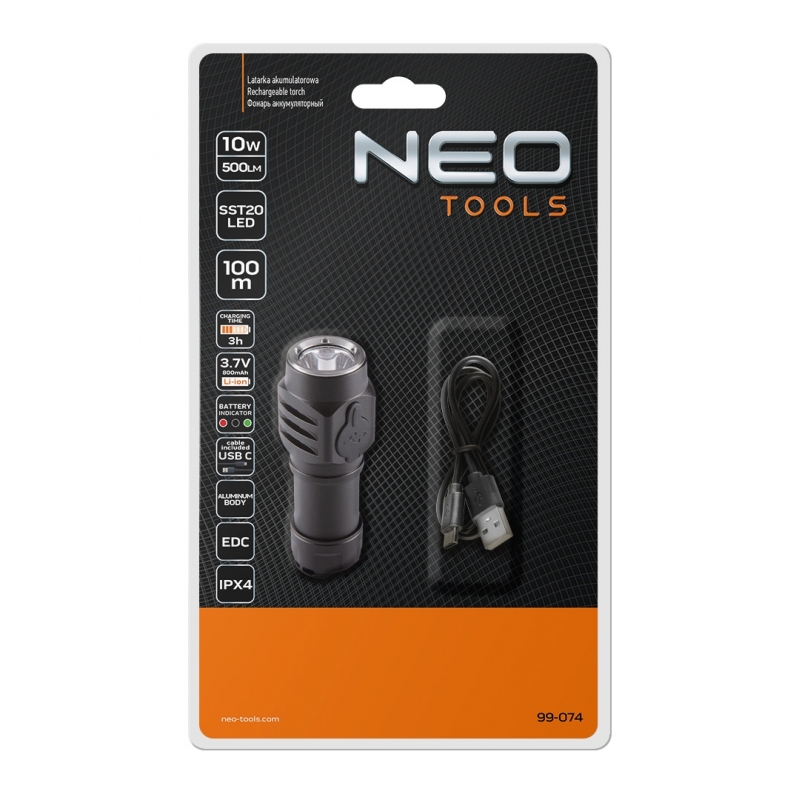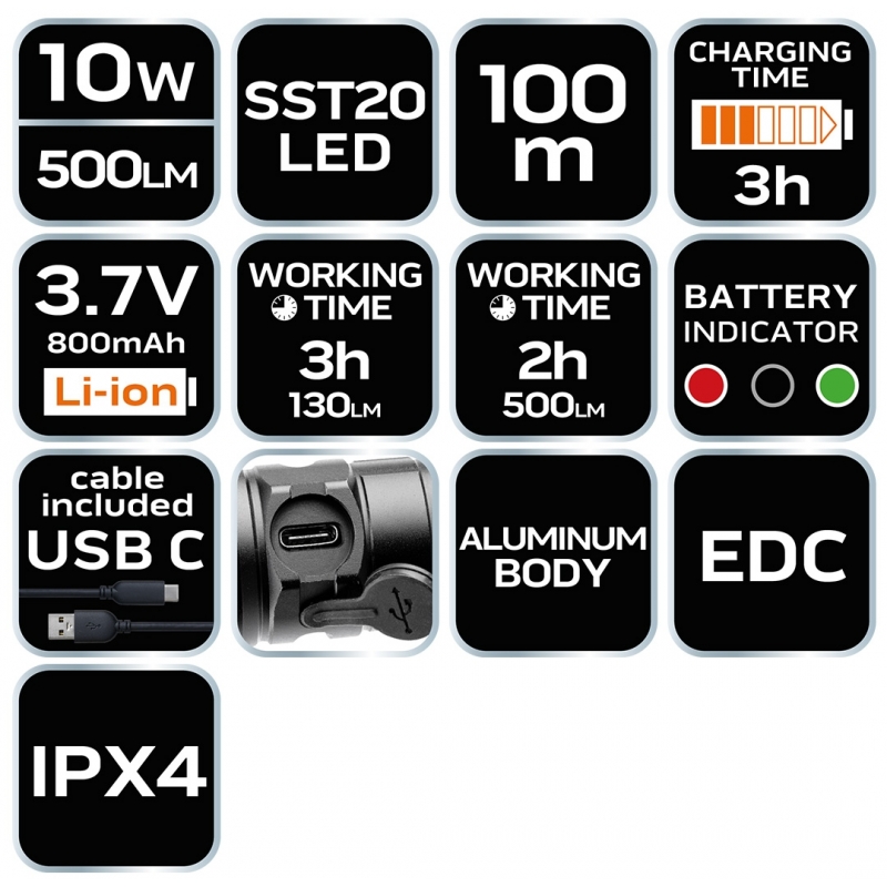 Latarka akumulatorowa USB C, 500 lm, 10W, SST20 LED, zasięg 100m, czas ładowania 3h, akumulator li-ion 3.7V 800mAh, wskaźnik ładowania baterii, przewód USB C, aluminiowy korpus, IPX 4, czas pracy 500lm 2h, czasp pracy 130lm 3h