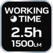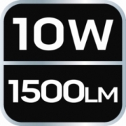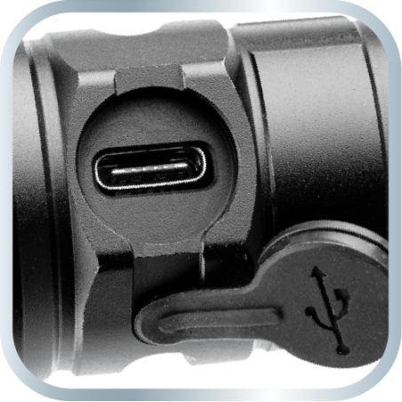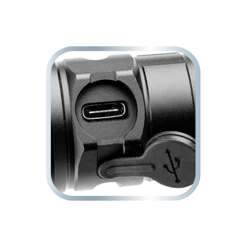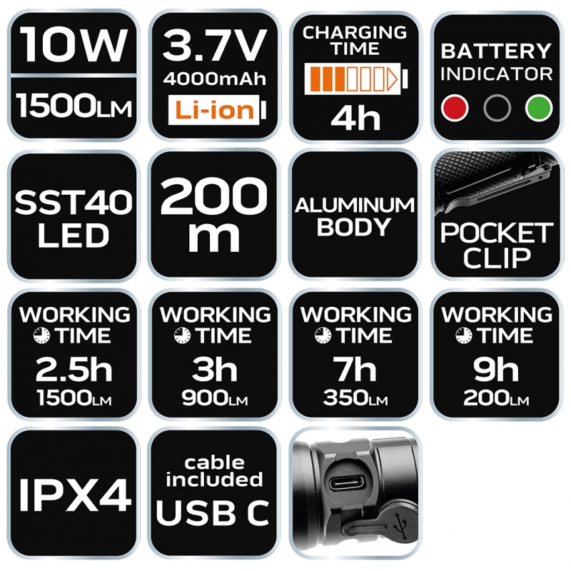 Latarka akumulatorowa USB C 1500 lm, 10W, SST40 LED, zasięg 200m, czas ładowania 5h, czas pracy 1500lm 2.h, czas pracy 900lm 3h, czas pracy 350lm 7h, czas pracy 200lm 9h, akumulator li-ion 3.7V 4000mAh, wskaźnik ładowania baterii, aluminiowy korpus, zaczep na kieszeń, IPX4, przewód USB C, funkcja SOS