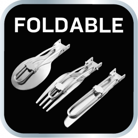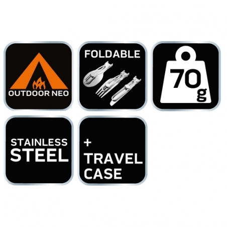 Sztućce turystyczne 3 in 1 łyżka, nóż, widelec, składana konstrukcja, waga 70g, materiał stal nierdzewna, etui do przenoszenia, certyfikat dopuszczenia do kontaktu z żywnością LFGB
