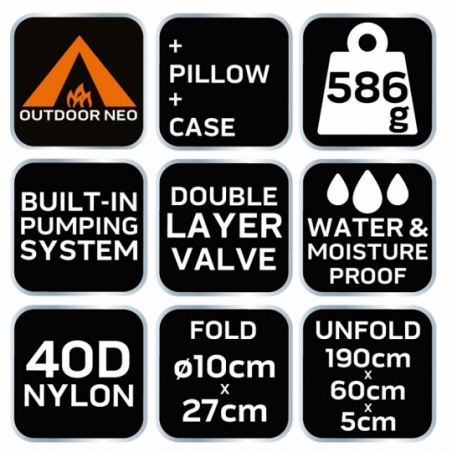 Materac turystyczny rozmiar rozłożony 190x60x5cm, wymiar złożony średnica 10cm, długość 27cm, waga 586g, materiał nylon 400, materiał wodoodporny, podwójny warstwa materiału, poduszka, etui do transportu, wbudowany system pompowania