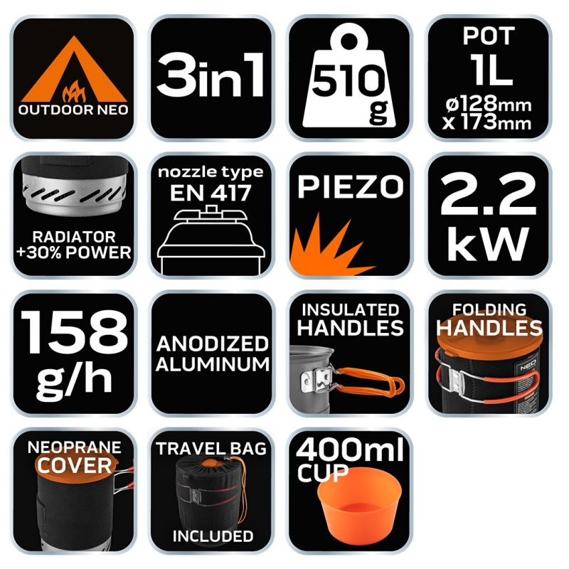 Kuchenka turystyczna 3 w 1 garnek, palnik, talerz, piezzo, regulowany strumień gazu, waga 510g, moc 2.2kW, 158g/h, materiał garnka anodyzowane aluminium, materiał talerza tworzywo sztuczne, radiator +30% mocy, pojemność talerza 400ml, uchwyty składane, izolowane, neoprenowa osłona garnka, pokrywa, do kartuszy EN 417 NEO 20-036, torba transportowa, certyfikat dopuszczenia do kontaktu z żywnością LFGB