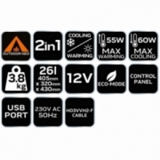 Lodówka turystyczna 2 w 1 grzanie i chłodzenie, waga 3.8kg, pojemność 26l, wymiary 405x320x430mm, eco-mode, zasilanie 230V oraz 12V, dwa przewody w zestawie 230V i 12V, elektroniczny panel sterujący, przewód zasilający HO3VVH2-F, port USB, chłodzenie max 60W, grzanie max 55W, uchwyt do przenoszenia