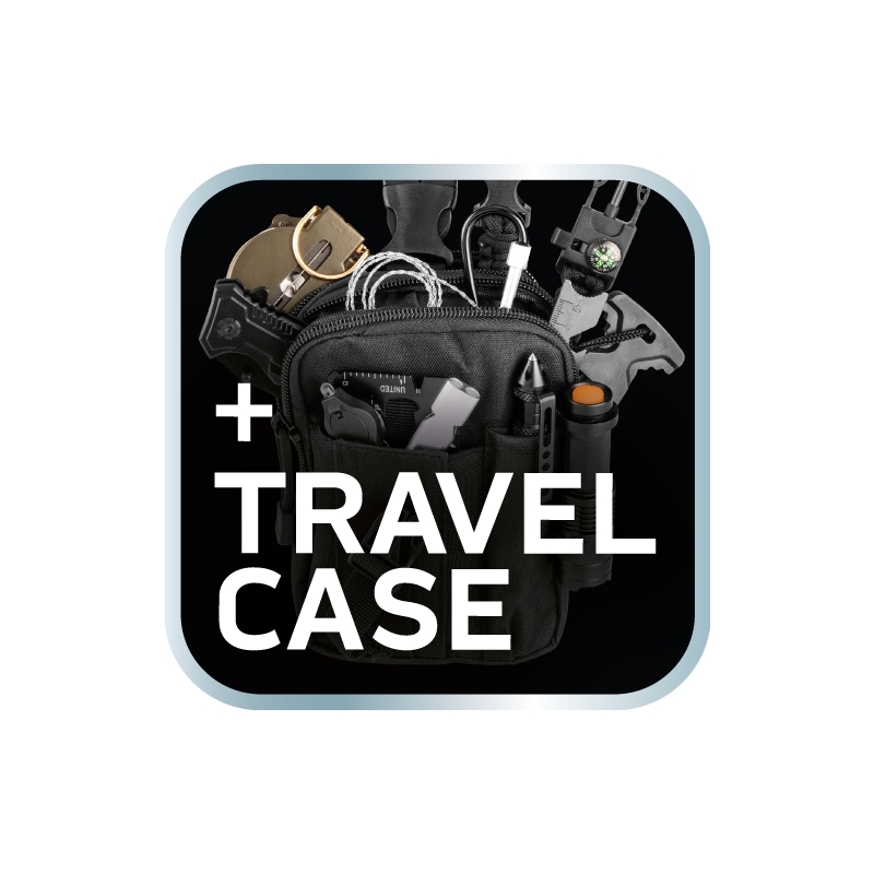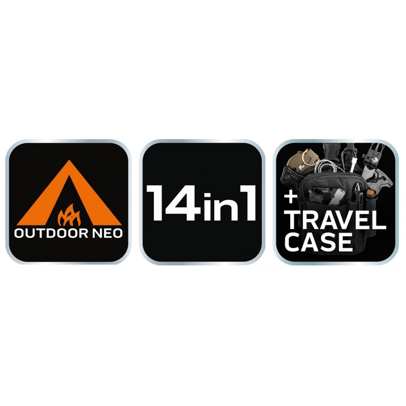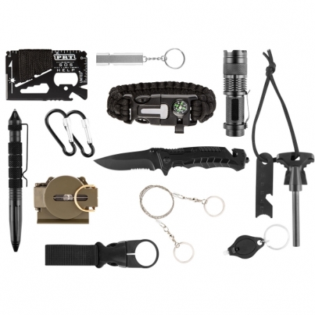 Zestaw survivalowy 14 w 1 w pouchu zestaw zawiera krzesiwo z otwieraczem do butelek, nóż z ostrzem składanym, latarka, bransoletka przetrwania (lina paracord, krzesiwo, kompas), gwizdek, karta wielofunkcyjna (wykonana ze stali nierdzewnej, zawiera otwieracz do butelek, otwieracz do puszek, piłę, klucz oczkowy w rozmiarach 4, 5, 6, 7 mm, miarka, wkrętak płaski, nóż, line paracord), piła drutowa, długopis taktyczny, klips do zawieszenia butelki, kompas rozkładany, karabińczyka 2 sztuki, mini latarka z breloczkiem, torba z klamrami do pask