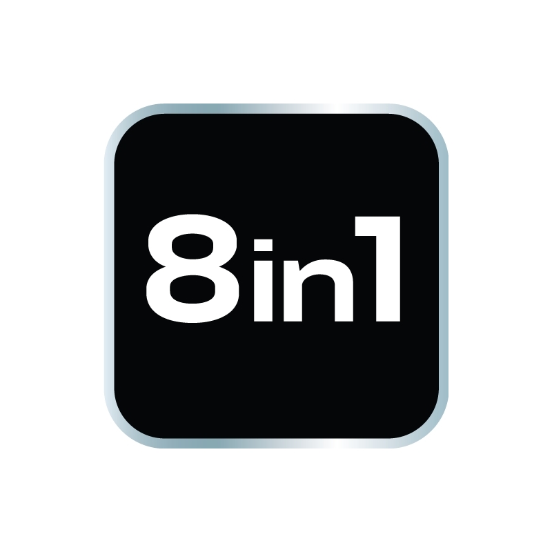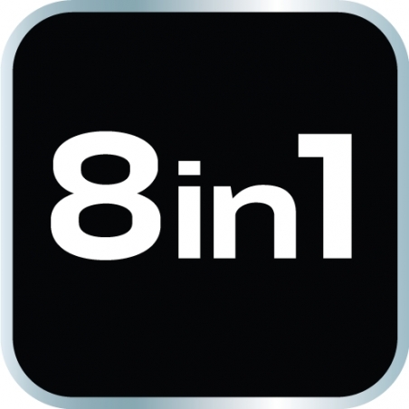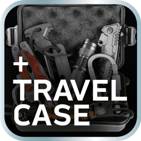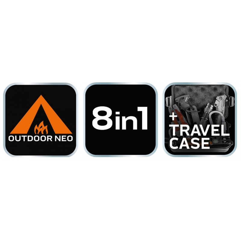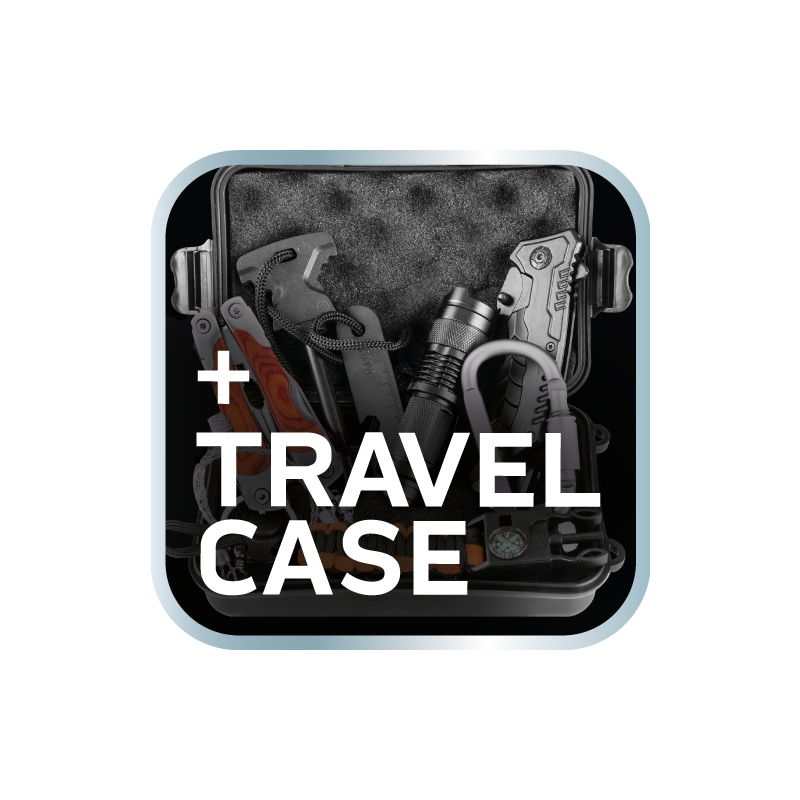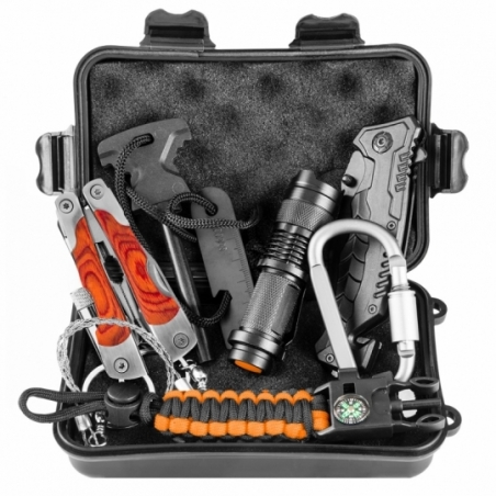 Zestaw survivalowy 8 w 1 w pudełku zawiera nóż z ostrzem składanym, latarka, multitool, piła drutowa, bransoletka przetrwania (lina paracord, krzesiwo, kompas), krzesiwo z otwieraczem do butelek, karabińczyk, pudełko plastikowe