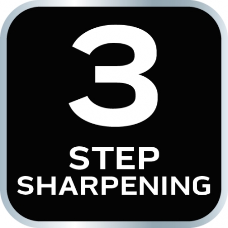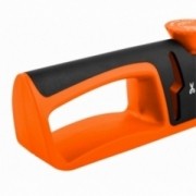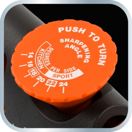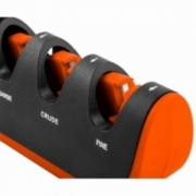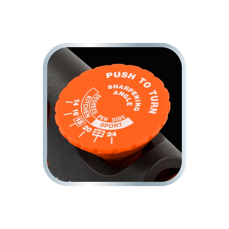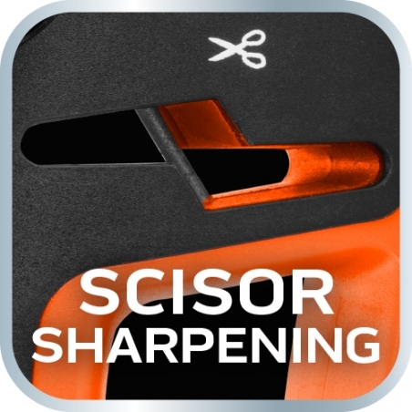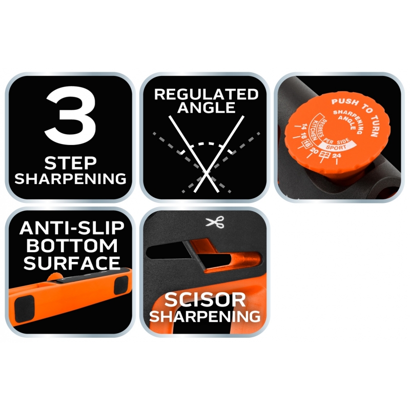 Ostrzałka do noży i nożyczek, obudowa wykona z odpornego na uderzenia tworzywa ABS, częściowo pokryta gumą TPR. Trzystopniowe ostrzenie noży: wstępne, zgrubne - diamentowe, wyrównujące i nadające kształt ostrza - z węglika wolframu oraz polerujące - ceramiczne. Pokrętło umożliwiające wybór kąta ostrzenia. Specjalna diamentowa ściernica do ostrzenia nożyczek. Podstawa antypoślizgowa, ergonomiczny kształt uchwytu.