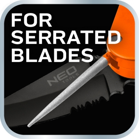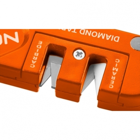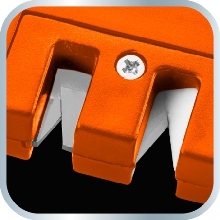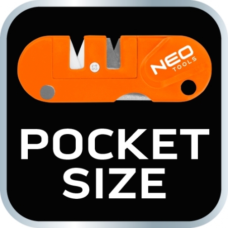 Ostrzałka do noży, obudowa wykona z odpornego na uderzenia tworzywa ABS. Dwustopniowe ostrzenie noży: wstępne i nadające kształt ostrza - z węglika wolframu oraz polerujące - ceramiczne. Specjalny diamentowy stożkowy pręt do ostrzenia ząbkowanych ostrzy. Poręczny, kieszonkowy, ergonomiczny kształt.