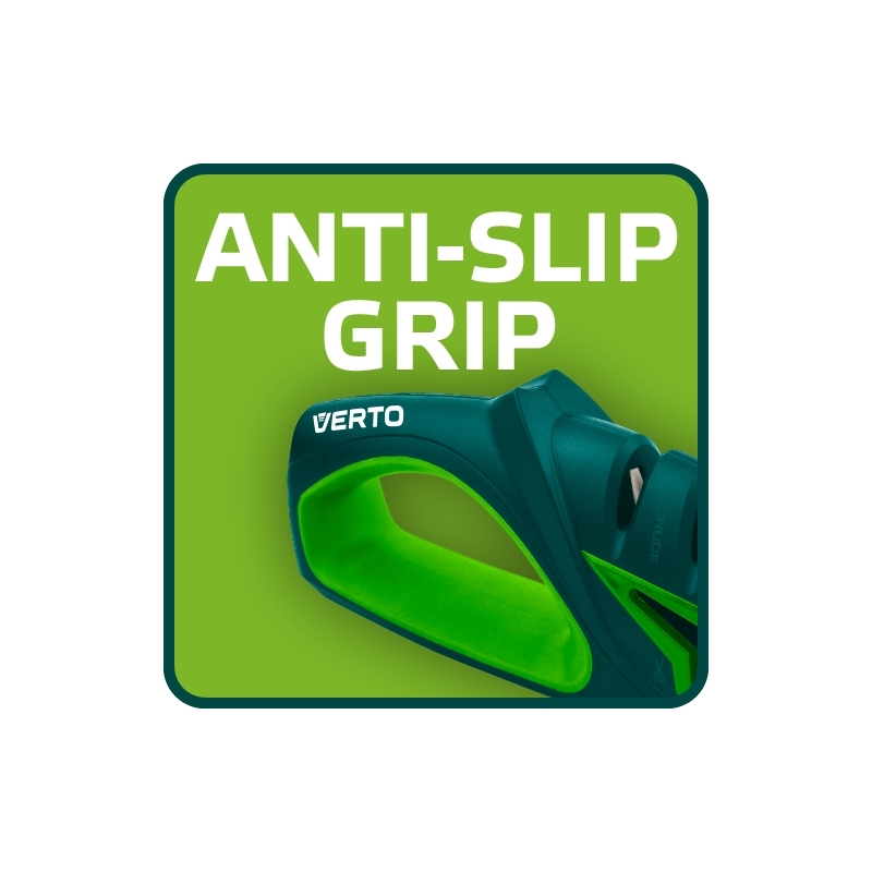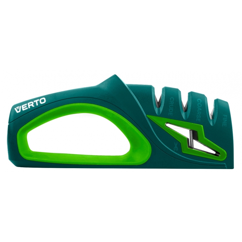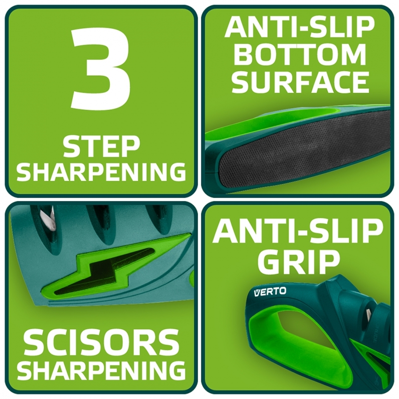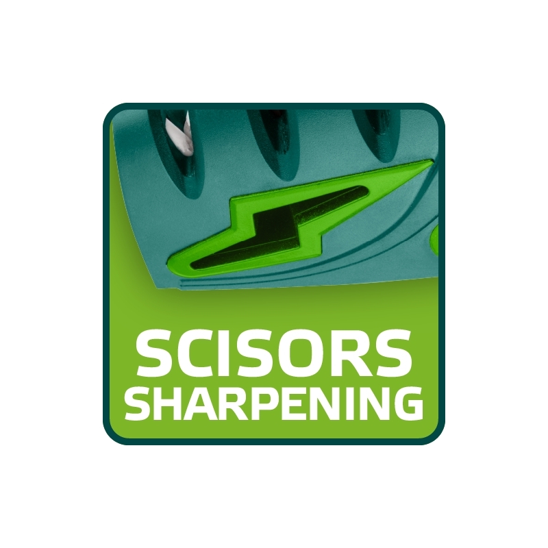 Ostrzałka do noży i nożyczek, obudowa wykona z odpornego na uderzenia tworzywa ABS, częściowo pokryta gumą TPR. Trzystopniowe ostrzenie noży: wstępne, zgrubne - diamentowe, wyrównujące i nadające kształt ostrza - z węglika wolframu oraz polerujące - ceramiczne. Specjalna diamentowa ściernica do ostrzenia nożyczek. Podstawa antypoślizgowa, ergonomiczny kształt uchwytu.