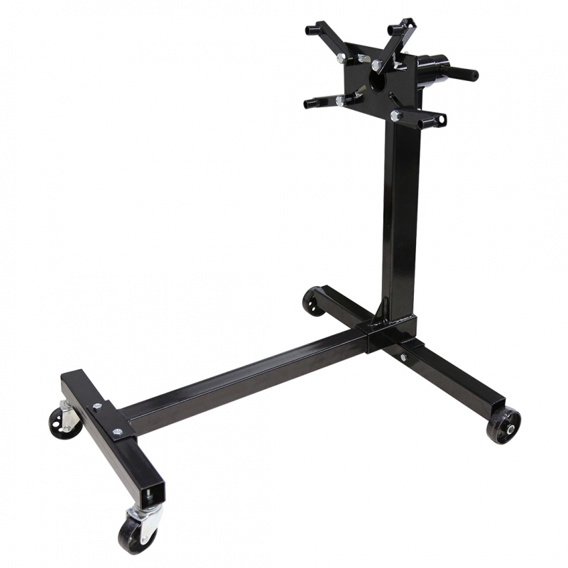 Stojak na silnik, nośność 450 kg, obrotowy uchwyt motażowy silnika 360˚, łożyskowane kółka obrotowe z przodu i stałe z tyłu.