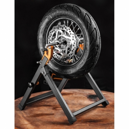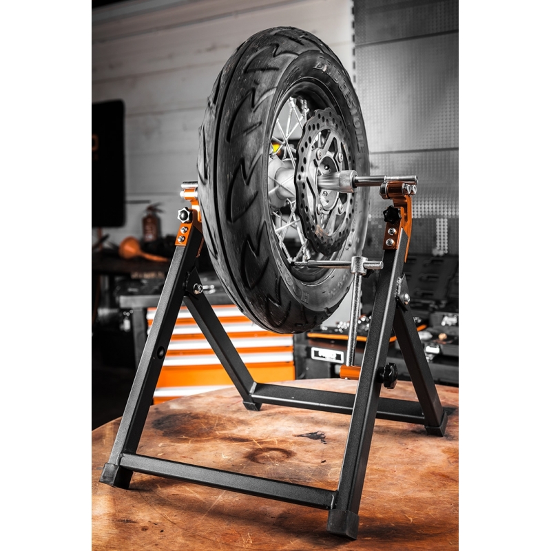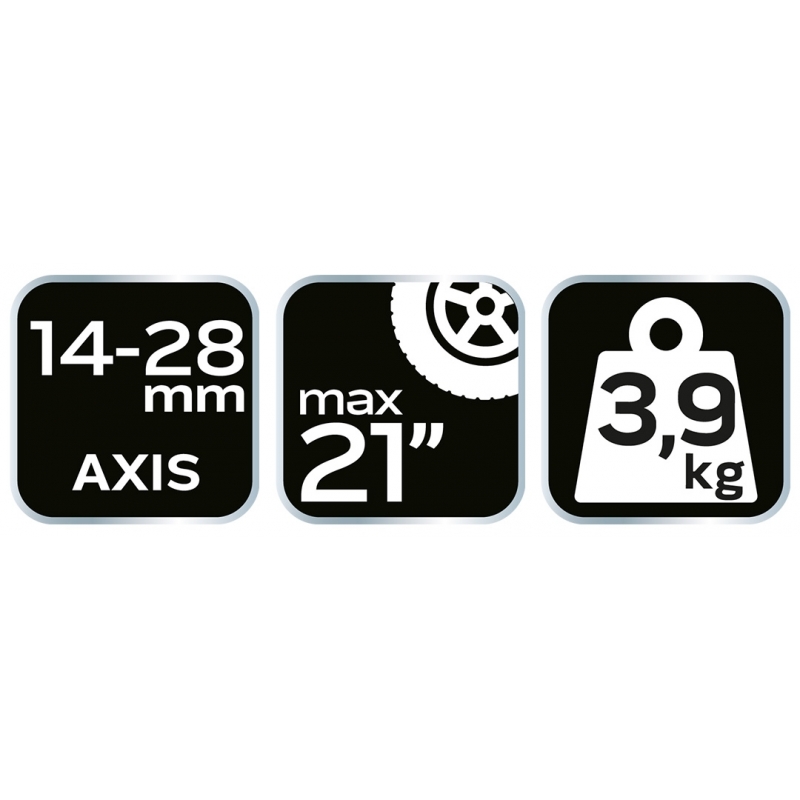 Wyważarka statyczna do kół motocyklowych, przenośna, składana, maksymalna średnica koła 21", zakres średnicy osi od 14 do 28 mm, dł.: 390mm sz.:345mm, wys.: 396mm, waga 3,9 kg, wykonane ze stali;