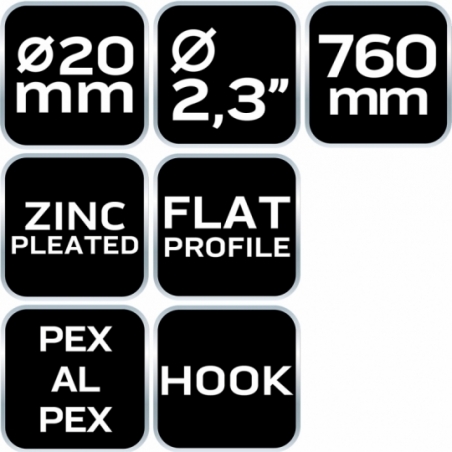 Sprężyna do gięcia rur PEX rozmiar szerokość 20 mm, długość 760 mm, średnica drutu 2.3 mm, powierzchnia ocynkowana, antykorozyjna, profil płaski, hak