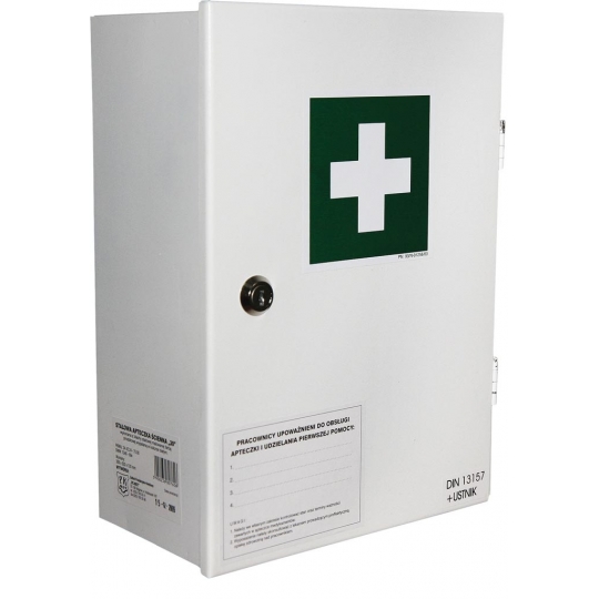 Raw-Pol AS30 to ścienna apteczka pierwszej pomocy wykonana z trwałej blachy stalowej malowanej proszkowo na biało. Wyposażona zgodnie z normą DIN 13157:2021, zawiera m.in. opatrunki, kompresy, bandaże, chusty, nożyczki, maski, rękawiczki, instrukcję pierwszej pomocy oraz aparat do sztucznego oddychania. Przeznaczona do zakładów pracy, hoteli, gastronomii, służb ratowniczych i ochrony.