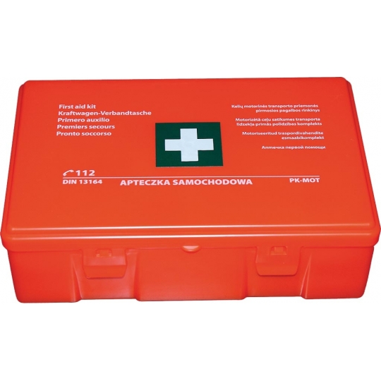 Apteczka pierwszej pomocy, samochodowa. - wykonana z tworzywa sztucznego (polistyren) - wyposażenie zgodne z normą DIN 13164 - 14-częściowy zestaw plastrów z opatrunkiem: 6x10 cm (4 szt.), 4,3x7,2 cm (2 szt.), 12x2 cm (2 szt.), 1,9x7,2 cm (2 szt.), 2,5x7,2 cm (4 szt.) - plaster na szpulce 5 m x 2,5 cm (1 szt.) - bandaż elastyczny 4 m x 6 cm (2 szt.) - bandaż elastyczny 4 m x 8 cm (3 szt.) - rękawiczki winylowe (2 pary) - chusteczki nasączone (2 szt.) - chusta opatrunkowa 60x80 cm (1 szt.) - chusta opatrunkowa 60x40 cm (1 szt.) - bandaż z kompresem (opatrunek indywidualny) 6x8 cm (1 szt.) - bandaż z kompresem (opatrunek indywidualny) 8x10 cm (2 szt.) - bandaż z kompresem (opatrunek indywidualny)10x12 cm (1 szt.) - kompres na rany 10x10 cm (6 szt.) - chusta trójkątna 96x96x136 cm (2 szt.) - koc termiczny 160x210 cm (1 szt.) - nożyczki (1 szt.) - instrukcja udzielania pierwszej pomocy - wymiary apteczki:26x17x8