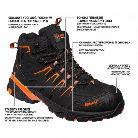 Buty ochronne nieposiadające elementów metalowych, w klasie S3, wodoodporne, odporne na ciepło kontaktowe do 300° oraz paliwa i materiały ropopochodne. Podeszwa o właściwościach antypoślizgowych SRC zapewnia dobrą stabilność podczas aktywności fizycznej. Komfort zwiększa amortyzacja w okolicy pięty, która niweluje wstrząsy spowodowane chodzeniem. Zabezpieczenia, które chronią stopy przed uszkodzeniami mechanicznymi, to kompozytowy podnosek i wkładka kevlarowa, które zapobiegają przebiciu stopy, a także odblaskowe elementy sznurowania, które zapewniają widoczność po ekspozycji na światło w półmroku i ciemności. Te buty są odpowiednie do pracy w wymagających warunkach.