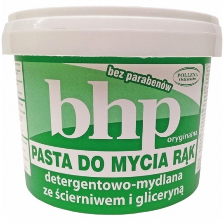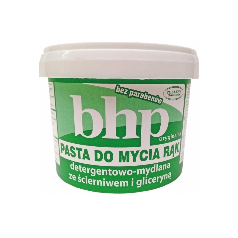 Pasta do rąk 500 g ze ścierniwem. - pasta do mycia rąk bhp detrgentowo-mydlana ze ścierniwem i gliceryną skutecznie usuwa silne zabrudzenia rąk typu tłuszcz, kurz, smar olej, sadza - pasta jest niezastąpiona w każdym warsztacie mechanicznym, ogrodzie, wszelkiego typu pracach domowych - zawarta w paście gliceryna działa nawilżająco na dłonie - łagodny materiał ścierny wspomaga usuwanie zabrudzeń bez podrażnienia rąk