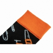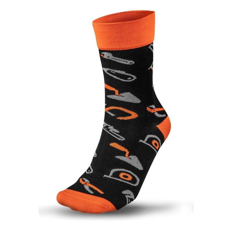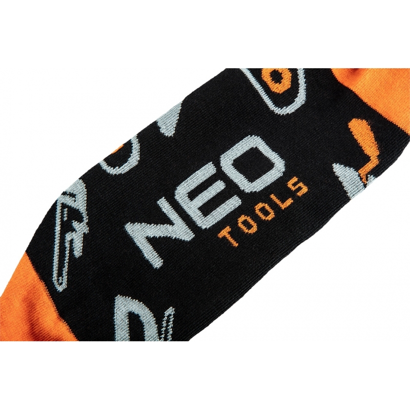 Skarpety kolorowe NEO TOOLS, Skład materiałowy: 80% bawełna, 18% poliester, 2% elastan, kompresyjny ściągacz nie powodujący ucisków, produkt zgodny z certyfikatem OEKO-TEX standard 100, oddychająca i odprowadzająca wilgoć, wzory narzędzi nawiązujące do marki Neo Tools, unikalny projekt własny, rozmiar 39-42