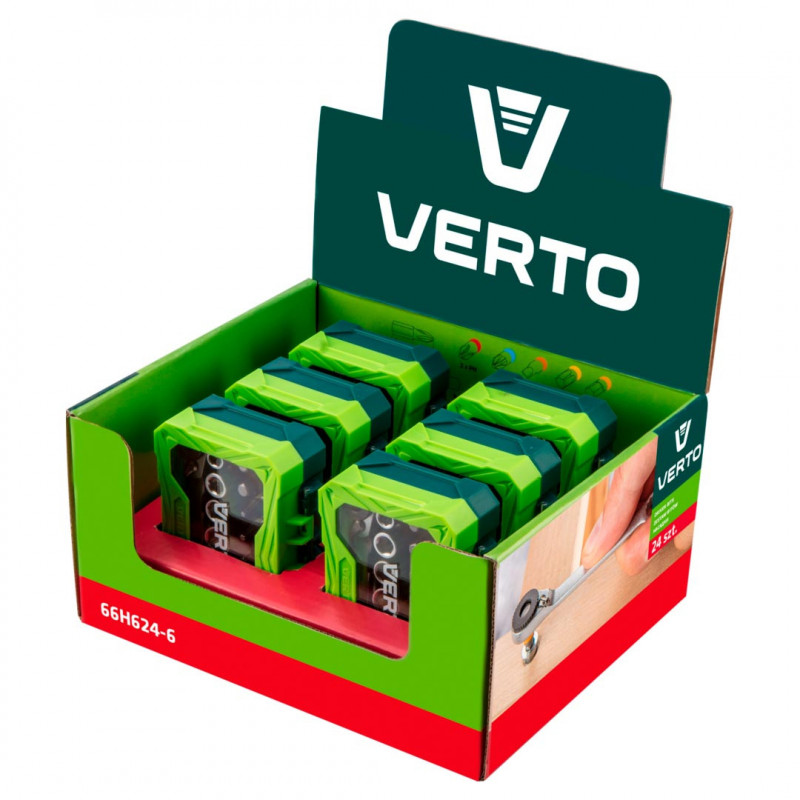 Display box 6 x 66H624 (Zestaw bitów i nasadek 24 szt., 25 mm - 2 x PH, 2 x PZ, 2 x SL, 4 x HEX, 5 x TX, nasadki 6 szt. + grzechotka do bitów, uchwyt magnetyczny, adapter do nasadek (CrV))