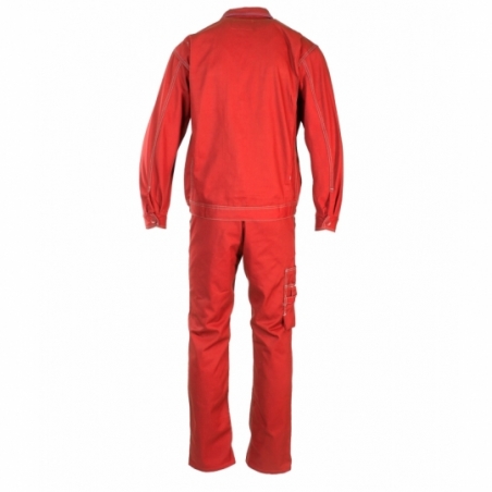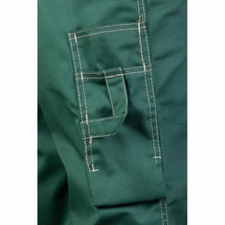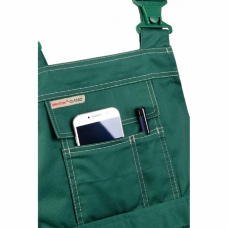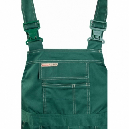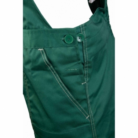 .Spodnie ogrodniczki: duża ilość ryglówek w miejscach szczególnie narażonych na rozprucie, możliwość regulacji w pasie za pomocą guzików oraz gumki wszytej w tylnej części spodni, długie, szerokie, regulowane szelki, dwie kieszenie boczne, wzmocnione kieszenie boczne, wzmocniona kieszeń zapinana na rzepy, kieszeń na komórkę, kieszeń na długopisy, kieszeń na miarkę „metrówkę”, szlufka na młotek, podwójne szwy, szyte widoczną, mocną nicią, wykonane z wysokiej jakości materiału, który zapewnia po wielokrotnym praniu stabilność kolorów i rozmiarów, wewnętrza kieszeń na dokumenty zapinana na zamek,