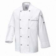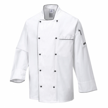 - Wysokiej jakości bluza kucharska z kontrastową lamówką i wentylacją pod pachami. Kieszeń na klatce piersiowej i ramieniu. Posiada specjalne wykończenie zapobiegające zagnieceniom. Jest komfortowa i bardzo dobrze wygląda.