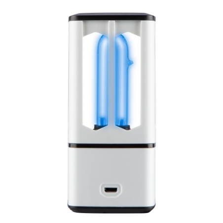 Lampa UVC dezynfekująca, bakteriobójcza, wirusobójcza, ozonowanie, 3.8W, 5V, do dezynfekcji szafy, samochódu, do dezynfekcji przedmiotów (np. smartfony, laptopy), zabija bakterie, wirusy, roztocza, brzydkie zapachy, z funkcją ozonowania, z opóźnionym startem 30 sek. koniecznym dla bezpiecznego użytkowania, dla powierzchni 3 m2, lampa bezprzewodowa, ładowana, wyjście USB do kabla do ładowania, czas pracy 30 min, plastikowa obudowa.