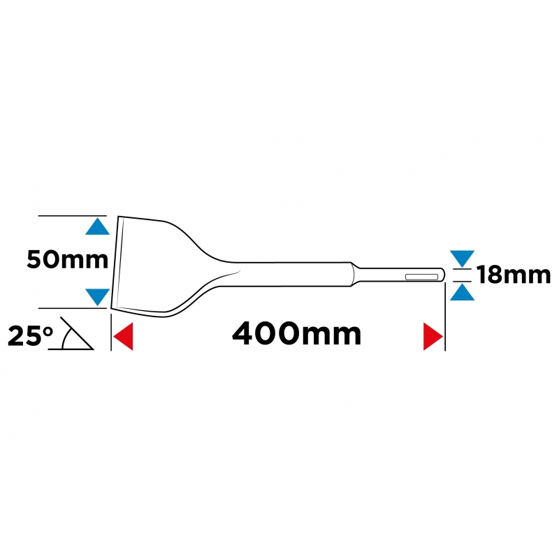 Dłuto SDS Max, szerokość 50 mm, średnica trzpienia 18 mm, długość 400 mm, kąt nachylenia 25 stopni