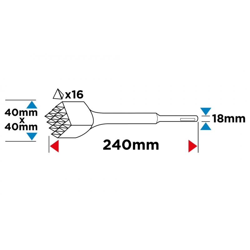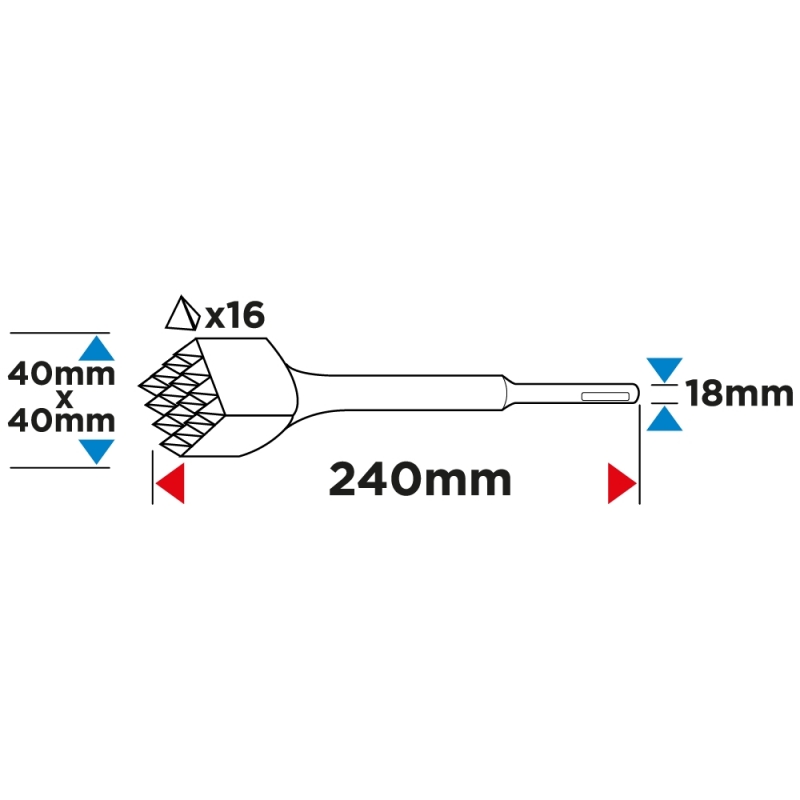 Groszkownik SDS Max, konstrukcja jednoczęściowa, wymiary części roboczej 40 x 40 mm, 16 zębów, długość 240 mm