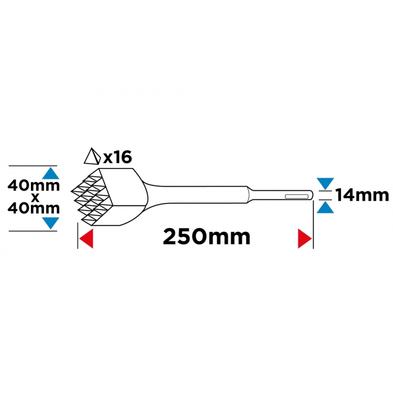 Groszkownik SDS Plus, konstrukcja jednoczęściowa, wymiary części roboczej 40 x 40 mm, 16 zębów, długość 250 mm