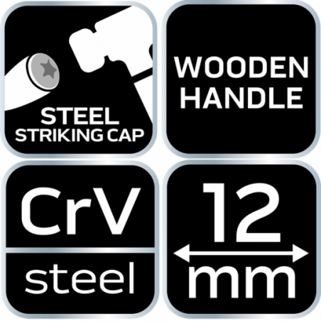 Dłuto do drewna, szerokość ostrza 12 mm, ostrze ze stali CrV, drewniany uchwyt, wzmocnienie do pobijania