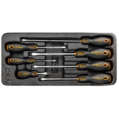 Wkrętaki płaskie NEO (nr ref. 84-231) stal S2, trójgraniasty uchwyt, wzmocniona i magnetyczna końcówka, olejodporny uchwyt pokryty gumą TPR, miejsce na kciuk, TUV, rozmiary: 3.0x75mm, 5.5x100mm, 5.5x200mm, 6.5x38mm, 6.5x125mm, 6.5x150mm, 8x150mm, wkład profilowany